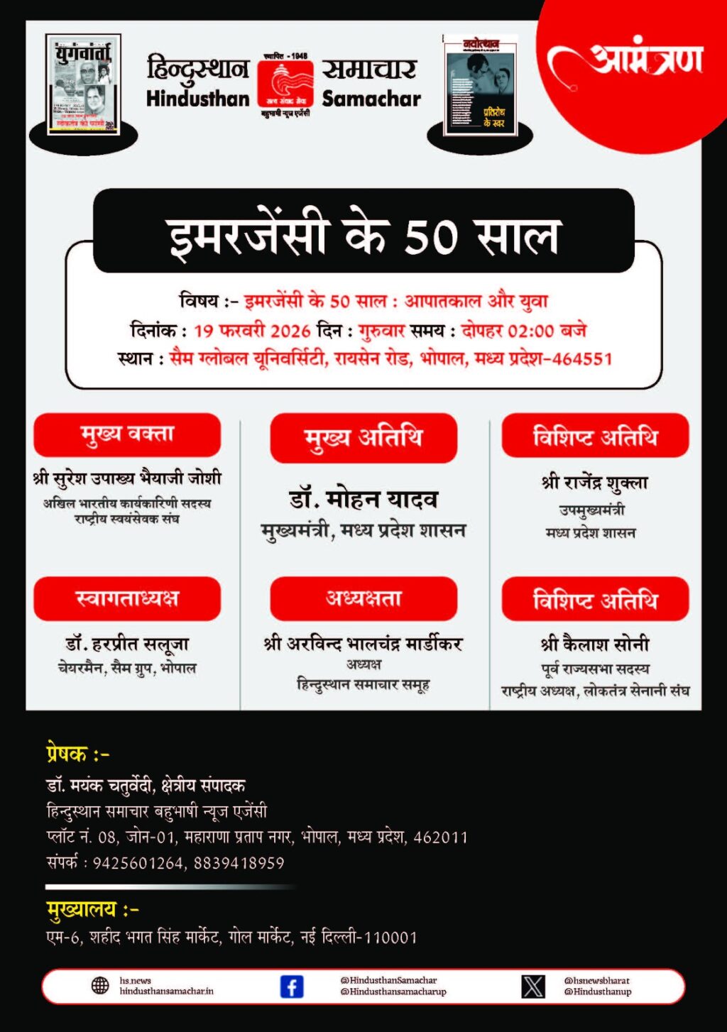 कार्यक्रम में हिन्दुस्थान समाचार के अध्यक्ष अरविंद भालचंद्र मार्डीकर ने भी संबोधित किया। कार्यक्रम में स्वागत उद्बोधन सैम ग्रुप के चेयरमैन डॉ. हरप्रीत सलूजा ने दिया, आभार प्रदर्शन हिन्दुस्थान समाचार न्यूज एजेंसी के क्षेत्रीय संपादक एवं मप्र ब्यूरो प्रमुख डॉ. मयंक चतुर्वेदी ने किया और कार्यक्रम का संचालन डॉ. निवेदिता शर्मा ने किया। इस दौरान सैम ग्लोबल यूनिवर्सिटी की कुलाधिपति प्रीति सलूजा, विद्यार्थियों, प्राध्यापकों, सामाजिक कार्यकर्ताओं एवं जनप्रतिनिधियों की उल्लेखनीय उपस्थिति रही।