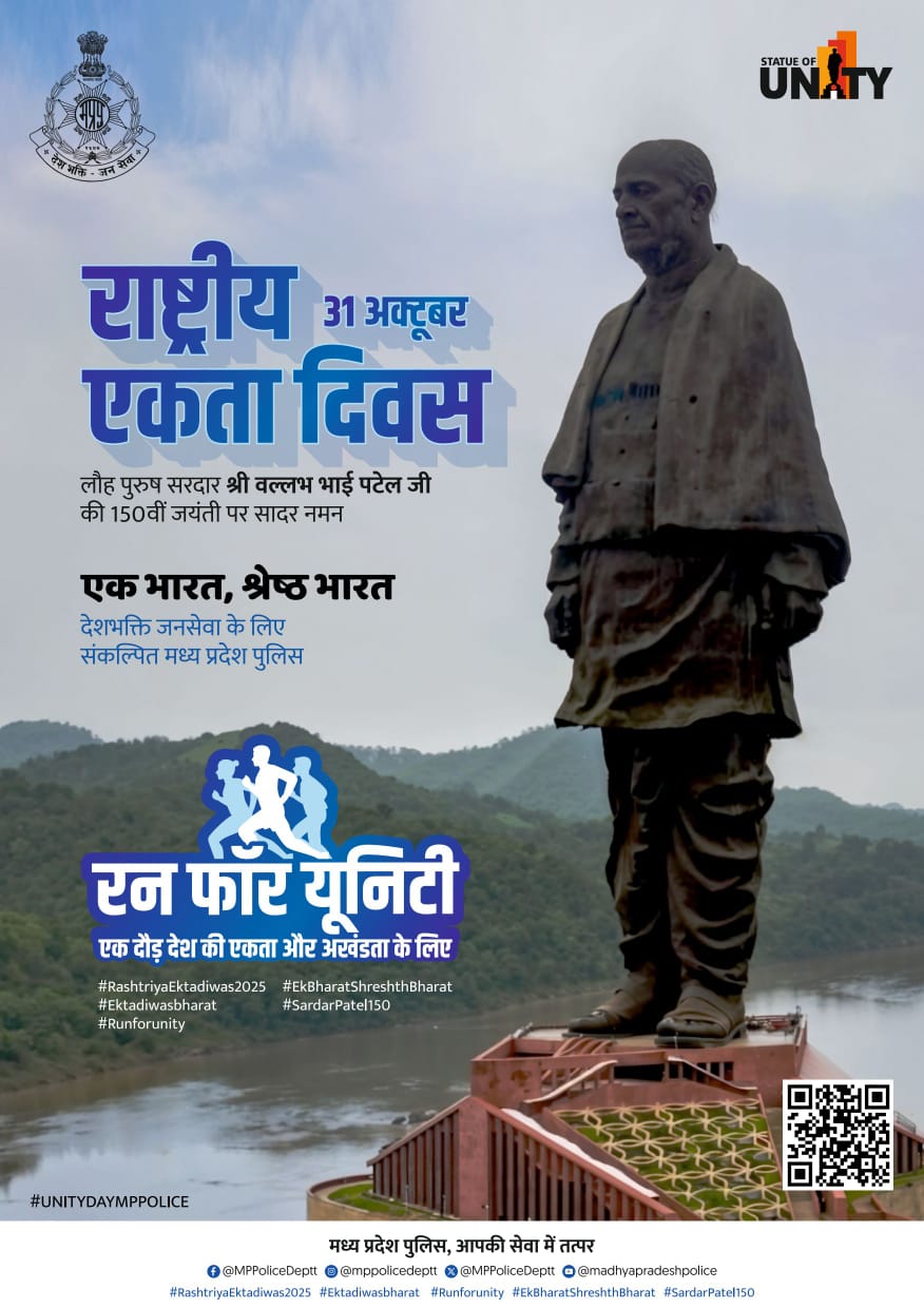भारत के लौह पुरुष सरदार वल्लभभाई पटेल की 150वीं जयंती के अवसर पर दिनांक 31 अक्टूबर 2025 को पूरे देश में राष्ट्रीय एकता दिवस मनाया जाएगा। इस उपलक्ष्य में मध्यप्रदेश पुलिस द्वारा राज्य के सभी जिलों और थाना स्तर पर “एकता दौड़ (Run for Unity)” का आयोजन किया जाएगा।
