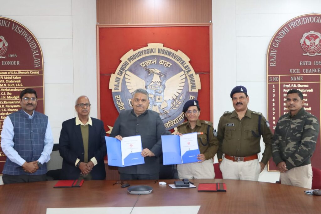 पुलिस प्रशिक्षण शाला, भौंरी, भोपाल और राजीव गांधी प्रौद्योगिकी विश्वविद्यालय , भोपाल के बीच आज एक ऐतिहासिक समझौता (एमओयू) पर हस्ताक्षर किए गए। इस कड़ी में पुलिस प्रशिक्षण शाला, भौंरी की पुलिस अधीक्षक श्रीमती रश्मि पांडेय और आरजीपीवी के कुलपति श्री राजीव त्रिपाठी के बीच हस्ताक्षरित हुआ। यह एमओयू आगामी 5 वर्षों के लिए किया गया है और इसका उद्देश्य नव आरक्षकों को कंप्यूटर बेसिक अवेयरनेस सर्टिफिकेशन कोर्स प्रदान करना है।