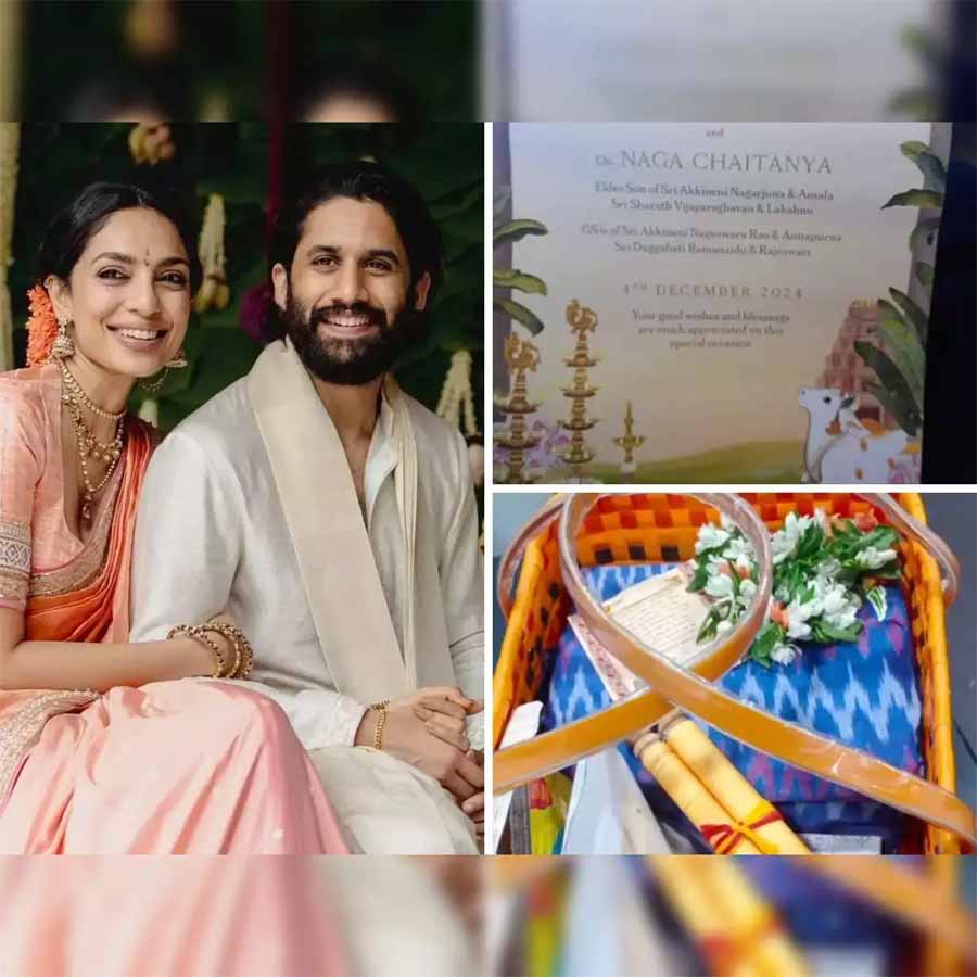 हाल ही में नागा चैतन्य और शोभिता धुलिपाला की शादी के निमंत्रण कार्ड की एक तस्वीर सोशल मीडिया पर वायरल हो गई। कार्ड पर, शादी की तारीख 4 दिसंबर, 2024 छपी थी, साथ ही होने वाले पति-पत्नी के नाम भी छपे थे। कार्ड पेस्टल रंग पैलेट में बनाया गया था और इसमें आधुनिकता और परंपरा का मिश्रण है। कार्ड में लटकी हुई मंदिर की घंटियां, पीतल के लैंप, बैकग्राउंड में एक मंदिर, हरियाली और केले के पत्ते सहित एक सफेद गाय का प्रिंट था।