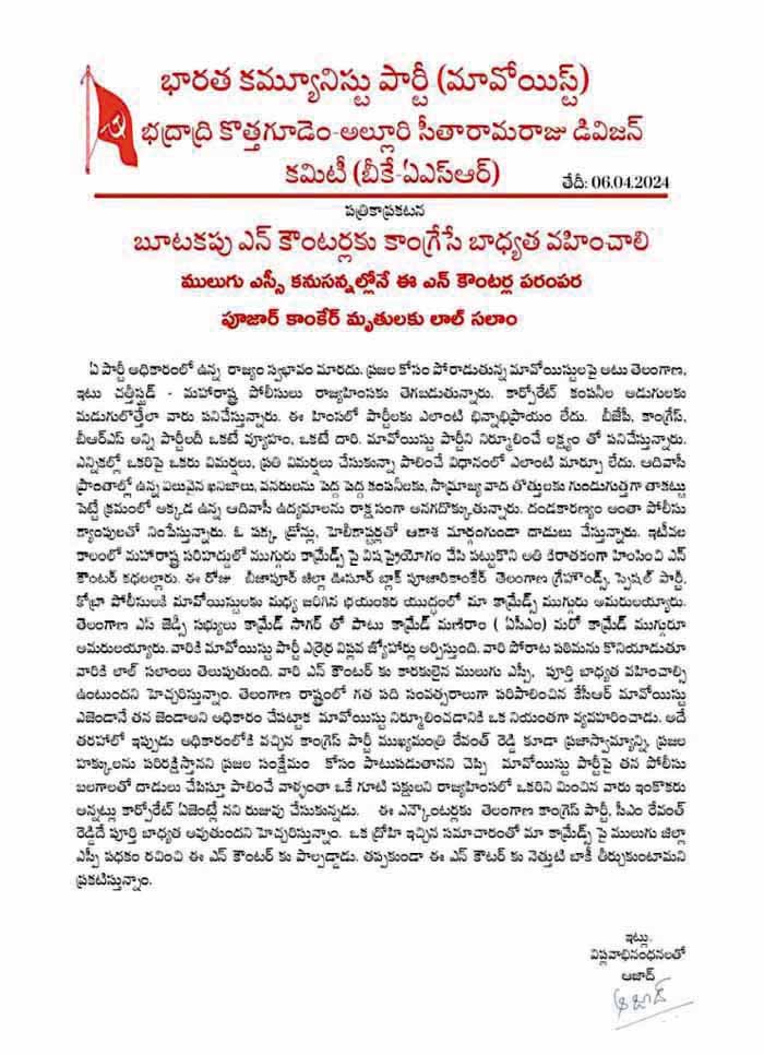 भद्राद्री कोठागुडेम, अल्लूरी सीता रामराजू डिवीजन समिति (बीके-एएसआर) के द्वारा जारी विज्ञप्ति में कहा गया है कि चाहे कोई भी पार्टी सत्ता में हो राज्य का स्वरूप नहीं बदलता। लोगों के लिए लड़ रहे नक्सलियों के खिलाफ तेलंगाना सरकार, छत्तीसगढ़ – महाराष्ट्र राज्य से पुलिस का सहारा ले रही है। वहीं कॉरपोरेट कम्पनियों के लिए मदद कर रही है। इस हिंसा में पार्टियों में कोई मतभेद नहीं हैं। आगे लिखा गया है कि बीजेपी, कांग्रेस और बीआरएस सभी दलों की एक ही राजनीति एक ही तरीका है। ये नक्सलियों को खत्म करने के लिए काम कर रहे हैं। जारी विज्ञप्ति में यह भी लिखा है कि चुनाव के दौरान पार्टी एक दूसरे पर आरोप प्रत्यारोप करता है, लेकिन शासन बनने के बाद कोई बदलाव नहीं आता है। नक्सलियों ने स्वीकार किया है कि बीजापुर जिले के उसूर ब्लॉक के पुजारी कांकेर में तेलंगाना ग्रेहाउंड्स और कोबरा एवं पुलिस पार्टी ने हमारे तेलंगाना एसजेसी सदस्य कामरेड सागर और मनीराम (एसीएम) के अलावा एक और साथी कुल तीन साथी मारे गये हैं, हमारे तीन नक्सलियों का बदला खून के बदले खून से चुकाएंगे।