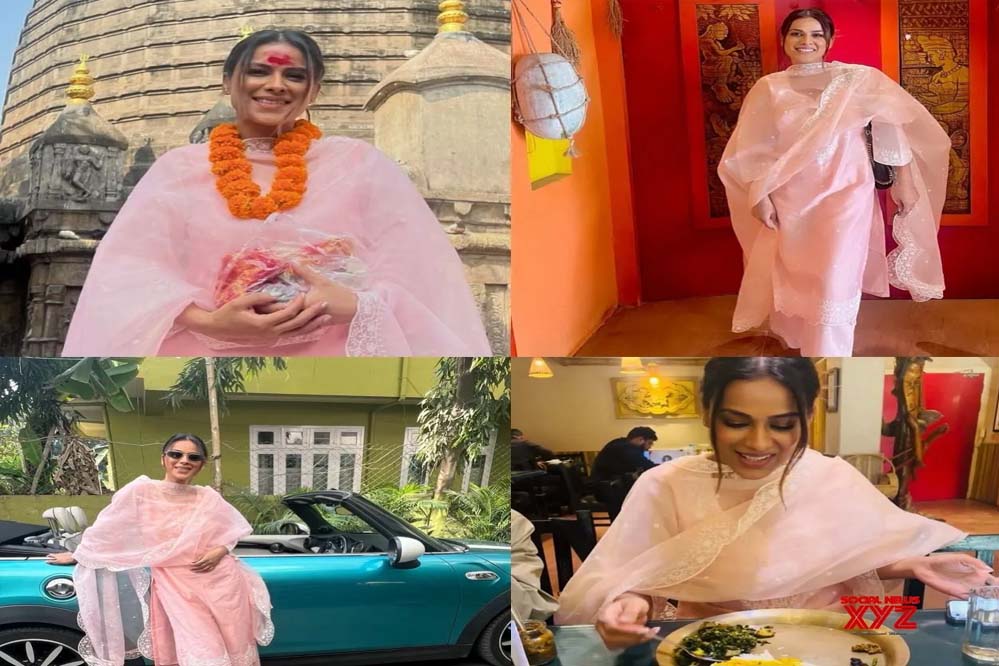 फोटोज में निया पाउडर पिंक कलर के सलवार सूट और मैचिंग दुपट्टा में नजर आ रही है। उन्होंने लो बन और न्यूट्रल मेकअप के साथ अपने लुक को पूरा किया। उनके माथे पर लाल तिलक और गले में माला पहनी हुई है। बैकग्राउंड में कामाख्या मंदिर नजर आ रहा है।