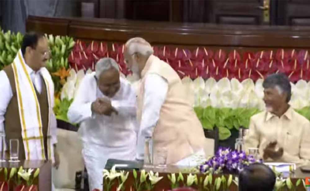 बिहार के मुख्यमंत्री और जनता दल यूनाइटेड (जेडीयू) के अध्यक्ष नीतीश कुमार ने दिल्ली में राष्ट्रीय जनतांत्रिक गठबंधन (एनडीए) के सांसदों की मीटिंग में अपनी पार्टी के समर्थन की घोषणा करने के बाद एक बार फिर से प्रधानमंत्री नरेंद्र मोदी का पांव छूकर सम्मान जताया है। लोकसभा चुनाव प्रचार के दौरान बिहार में पीएम मोदी की दूसरी रैली नवादा में थी और उस दौरान मंच पर बैठे नीतीश ने बगल में बैठे पीएम मोदी से बातचीत के क्रम में उनके पांव छूए थे। प्रधानमंत्री नरेंद्र मोदी उम्र में मुख्यमंत्री नीतीश कुमार से लगभग छह महीने बड़े हैं।