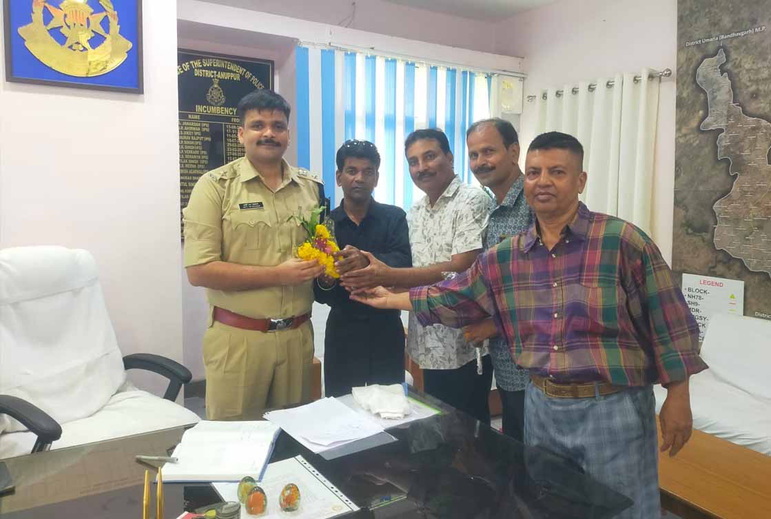 पुलिस अधीक्षक अनूपपुर मोती उर रहमान जी से अधिमान्य पत्रकार नेतृत्व समिति के पदाधिकारी गण सौजन्य भेंट की जिसमें अध्यक्ष डल्लू कुमार सोनी, प्रदेश उपाध्यक्ष दिनेश सिंह,प्रवीण चंद्रवंशी,दशरथ प्रसाद श्रीवास मोहम्मद कासिम, आदि पदाधिकारी ने सौजन्य भेंट की