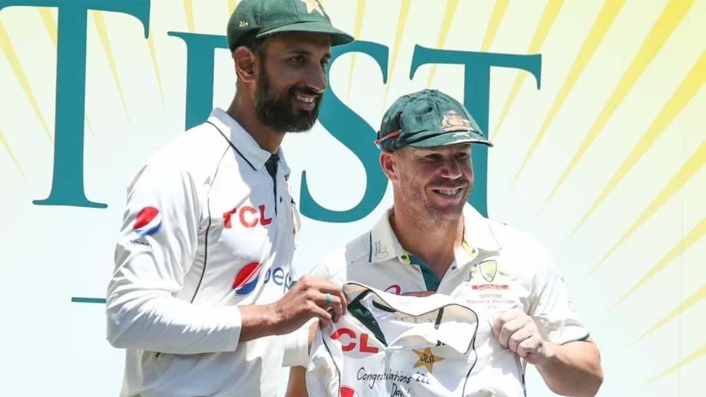 ऑस्ट्रेलिया के स्टार ओपनर वॉर्नर का शानदार टेस्ट करियर शनिवार को उनके घरेलू स्टेडियम में पाकिस्तान के खिलाफ आठ विकेट की जीत के साथ समाप्त हुआ। ऑस्ट्रेलिया ने तीन मैचों की सीरीज 3-0 अपने नाम की। मसूद ने मैच के बाद कहा, मैं डेविड वॉर्नर की सराहना करना चाहता हूं और कुछ उपहार देना चाहता हूं। आपका बहुत-बहुत धन्यवाद। हमने एक टीम के रूप में आपको सभी खिलाड़ियों के हस्ताक्षर वाली बाबर आजम की शर्ट देने के बारे में सोचा है।