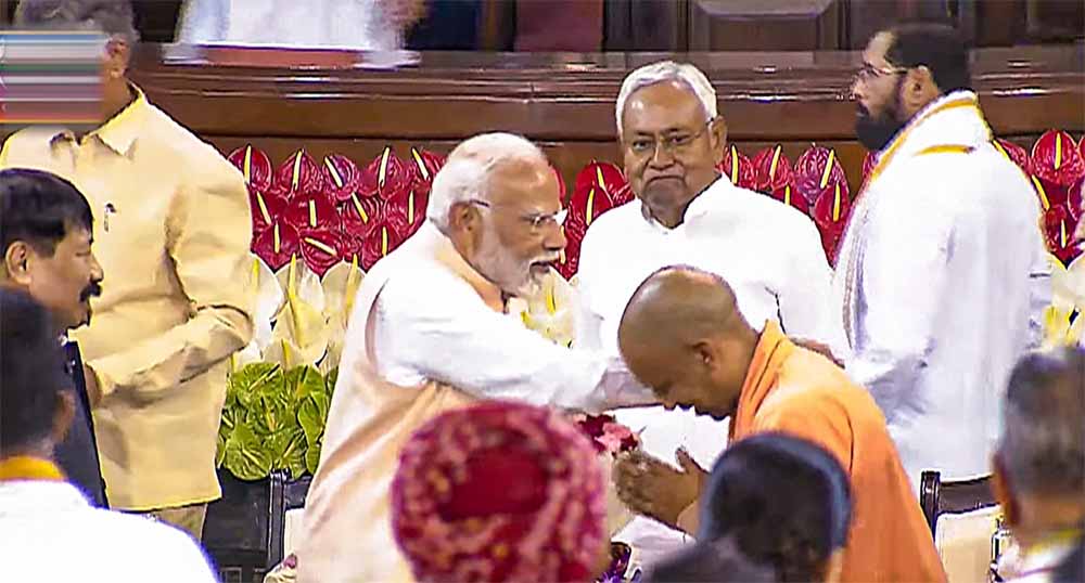 प्रधानमंत्री नरेंद्र मोदी ने पुरानी संसद के केंद्रीय कक्ष में राष्ट्रीय जनतांत्रिक गठबंधन (एनडीए) सांसदों की बैठक में उत्तर प्रदेश के मुख्यमंत्री योगी आदित्यनाथ की पीठ थपथपाई और भाजपा के विरोधियों को 'बड़ा संदेश' दिया। प्रधानमंत्री नरेंद्र मोदी को भगवा ब्लॉक के नेता के रूप में चुने जाने के बाद उनके भाषण के बाद एनडीए सांसदों, भाजपा मुख्यमंत्रियों, नेताओं द्वारा स्वागत किए जाने के बाद उस क्षण को कैमरे में कैद कर लिया गया।