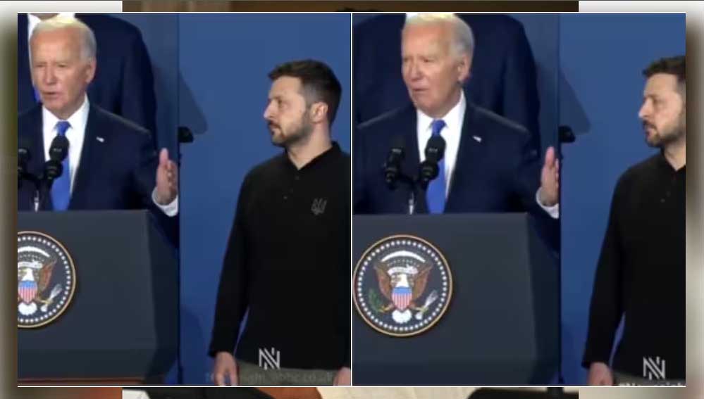 वीडियो में बाइडेन कहते हैं-'और अब मैं मंच यूक्रेन के राष्ट्रपति को सौंपना चाहता हूं, जिनके पास उतना ही साहस है जितना दृढ़ संकल्प है. देवियों और सज्जनो, राष्ट्रपति पुतिन.' ये सुनते ही ज़ेलेंस्की एक पल के लिए रुकते हैं और पोडियम लेने में झिझकते हैं.