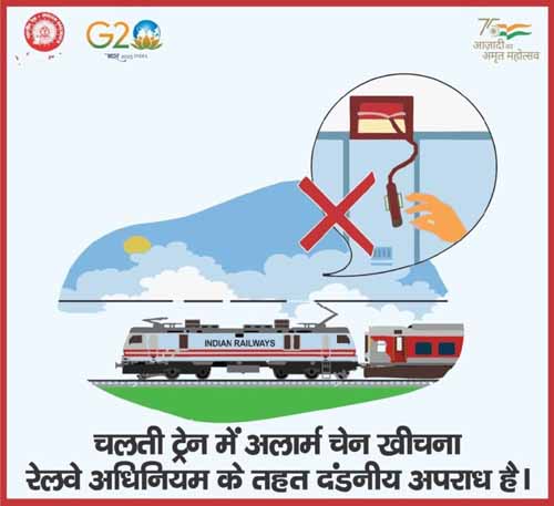 रेलवे अधिनियम के तहत उचित और पर्याप्त कारण के बिना जंजीर खींचना एक दंडनीय अपराध है। महिला व दिव्यांगों के लिए आरक्षित कोचों में अनाधिकृत व्यक्तियों का यात्रा करना एवं गाड़ियों के पायदान पर यात्रा करना भी अपराध की श्रेणी में आता है इसके लिए जागरूकता अभियान के साथ ही रेलवे सुरक्षा बल द्वारा इनके विरुद्ध कानूनी कार्यवाही भी की जाती है। इसी संदर्भ में रेलवे सुरक्षा बल बिलासपुर मंडल द्वारा ऐसी अवांछित गतिविधियों की रोकथाम बावत आरपीएफ द्वारा अभियान चलाकर माह जनवरी में चैन पुलिंग के 98 मामले पंजीबद्व किये गये तथा महिलाओं हेतु आरक्षित कोचों में अभियान चलाकर कुल 73 पुरूष यात्रियों एवं गाडी के पायदान में यात्रा करते 26 यात्रियों के विरूद्व रेलवे एक्ट के तहत कार्यवाही की गई है।