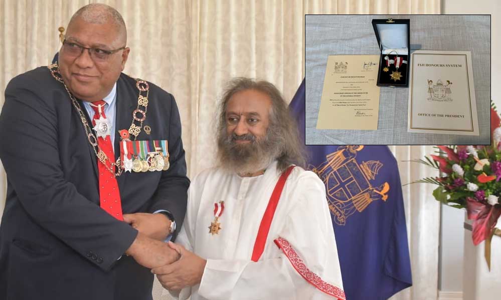फिजी गणराज्य के माननीय राष्ट्रपति महामहिम रातू विलियामे एम. कटोनिवेर ने गुरुदेव को 'ऑनरेरी ऑफिसर ऑफ द ऑर्डर ऑफ फिजी' की उपाधि से सम्मानित किया। फिजी, ऐसा छठा देश है जिसने आर्ट ऑफ लिविंग के माध्यम से गुरुदेव के मानवीय कार्यों को मान्यता दी है, जो पिछले 43 वर्षों से मानसिक स्वास्थ्य, शिक्षा, पर्यावरण, महिला और युवा सशक्तिकरण, तनाव राहत, और ध्यान कार्यक्रमों में सक्रिय हैं।