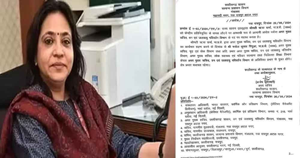 पहले से अतिरिक्त प्रभार देख रहे आईएएस मनोज कुमार पिंगुआ ऋचा शर्मा के पदभार ग्रहण करने की तारीसे मुक्त हो जाएंगे। शेष उनका प्रभार यथावत रहेगा। छत्तीसगढ़ सरकार ने केंद्रीय प्रतिनियुक्ति से वापस लौटते ही ऋचा शर्मा को बड़ी जिम्मेदारी सौंपी है। उन्हें वन एवं जलवायु परिवर्तन विभाग के अपर मुख्य सचिव पद पर पदस्थ किया गया है। इ