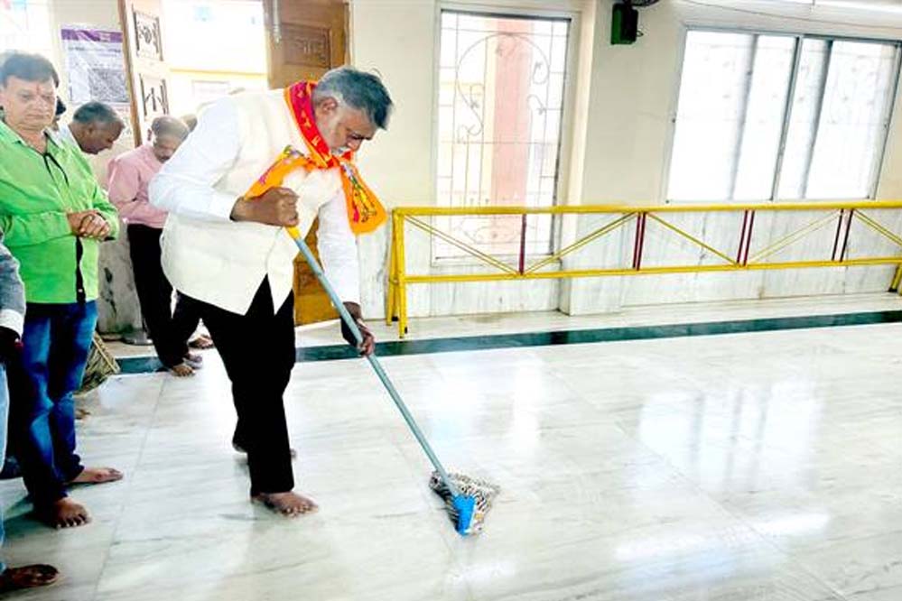 ग्रामीण विकास मंत्री पटेल ने मंदिर परिसर में झाड़ू और पोंछा लगाया