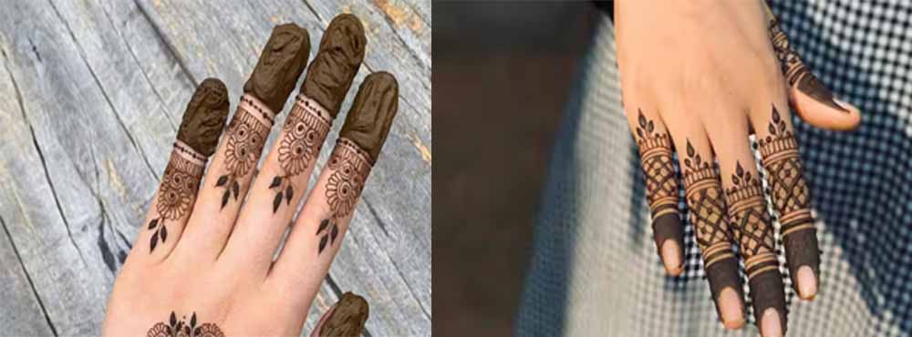 उंगलियों में बने हैवी और बारीक मेहंदी के डिजाइन हाथों पर खूब जचते हैं। ये डिजाइन काफी सिंपल हैं और आपकी उंगलियों को एक खूबसूरत लुक देंगे। आप चाहें तो सभी उंगलियों में सेम और एक में अलग डिजाइन बनाकर लुक को खास बना सकती हैं।