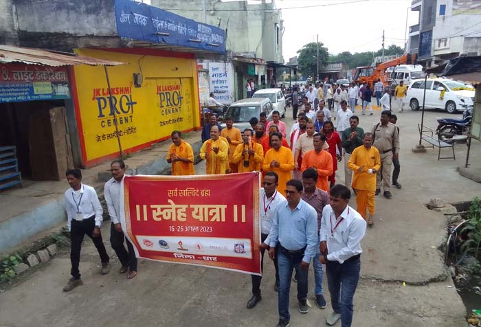 मध्यप्रदेश शासन के निर्देश पर मध्य प्रदेश जन अभियान परिषद द्वारा निकाली जा रही स्नेह यात्रा का आगमन आज बुधवार प्रातः 10:00 बजे से मनावर विकासखंड के ग्राम सिंघाना में हुआ। इस यात्रा में महामंडलेश्वर संत नरसिंह दास जी महाराज, संत जीवनदास जी महाराज,रामचंद्र मिशन के हाकम सिंह ठाकुर,माँ गायत्री परिवार के प्रतिनिधि की उपस्थिति में यात्रा नगर भ्रमण कर गायत्री मंदिर पहुंची। सिंघाना में यात्रा का भव्य स्वागत किया गया संतों ने अपनी वाणी से संबोधित करते हुए सनातन धर्म की विशेषताओं को बताया,साथ ही बताया कि इस यात्रा के माध्यम से समाज को एक सुत्र में बांधने का प्रयास किया जा रहा है।