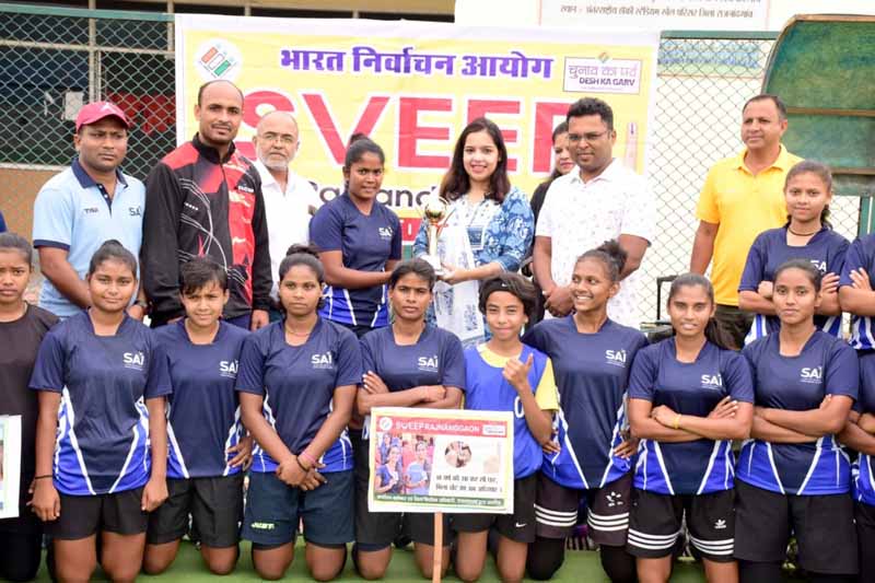 जिला पंचायत सीईओ एवं नोडल अधिकारी स्वीप सुश्री सुरूचि सिंह ने भारतीय खेल प्राधिकरण राजनांदगांव और खेलो इंडिया सेंटर राजनांदगांव महिला विंग्स खिलाडिय़ों से परिचय प्राप्त किया और सभी खिलाडिय़ों को बधाई एवं शुभकामनाएं दी। उन्होंने स्वीप हॉकी प्रतियोगिता की विजेता टीम भारतीय खेल प्राधिकरण राजनांदगांव को स्वीप हॉकी मतदान कप 2024 देकर सम्मानित किया। इसके साथ ही उप विजेता टीम खेलो इंडिया सेंटर राजनांदगांव को बधाई एवं शुभकामनाएं दी। उन्होंने मतदाता सूची में जुड़े खिलाडिय़ों को मतदान दिवस 26 अप्रैल को मतदान करने के लिए प्रेरित किया और अन्य खिलाडिय़ों से घर के अभिभावकों को मतदान करने के लिए प्रोत्साहित करने कहा। उन्होंने बताया कि 19 अप्रैल 2024 शुक्रवार को फिट राजनांदगांव, फिट वोटर्स, गुड मॉर्निंग राजनांदगांव कार्यक्रम पुष्प वाटिका रानी सागर के पास आयोजित किया जाएगा। जिसमें सभी को हिस्सा बनने कहा।