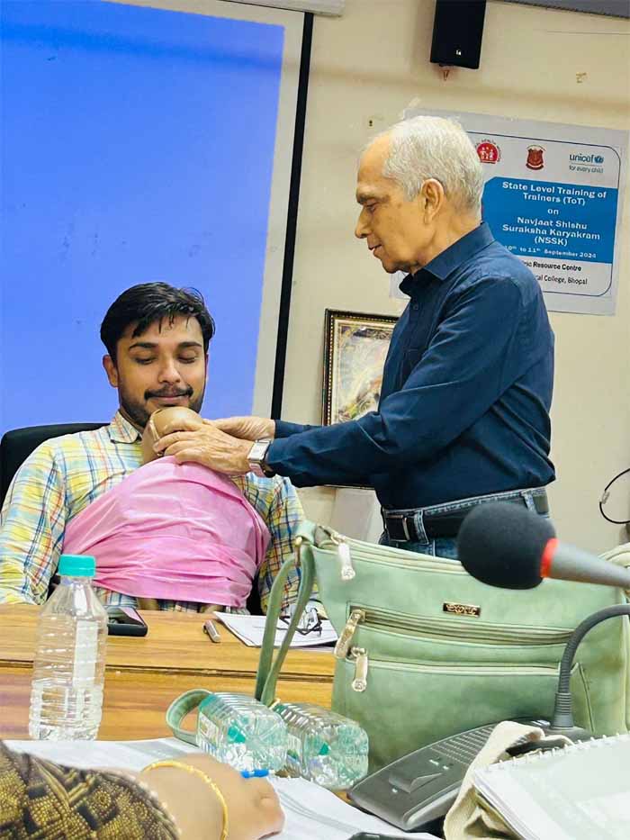 गांधी चिकित्सा महाविद्यालय, भोपाल में राज्य स्तरीय नवजात शिशु सुरक्षा कार्यक्रम (एनएसएसके) के तहत ट्रेनिंग ऑफ ट्रेनर्स (टीओटी) का आयोजन किया गया। इसके अंतर्गत जिलों के डिलीवरी प्वाइंट्स पर कार्यरत चिकित्सकों और स्टाफ नर्सों को नवजात शिशु स्थिरीकरण प्रक्रिया में दक्ष बनाने के लिए प्रशिक्षण दिया जा रहा है। गांधी चिकित्सा महाविद्यालय में स्थापित स्टेट न्यूबॉर्न एंड पीडियाट्रिक रिसोर्स सेंटर में आयोजित इस 2 दिवसीय प्रशिक्षण कार्यक्रम में 87 शिशु रोग विशेषज्ञों और महिला चिकित्सा अधिकारियों को प्रशिक्षित किया जा रहा है।