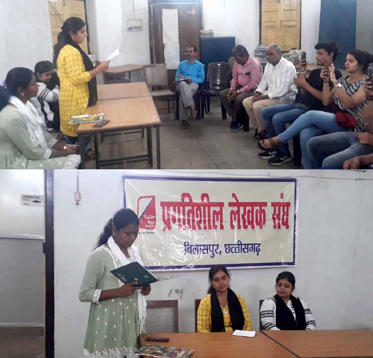 प्रगतिशील लेखक संघ की स्थानीय इकाई ने युवा रचनाशीलता पर केंद्रित एक काव्य गोष्ठी का आयोजन किया। उक्त गोष्ठी में शम्मी कुजूर, श्रुति सोनी और उपासना ने अपनी कविताओं का पाठ किया।इन कविताओं में अपने समय तथा परिवेश की स्थितियां, घटनाओं को बहुत ही प्रभावी ढंग से प्रस्तुत किया गया। युवा रचनाकारों की कविताओं में जीवन के विभिन्न पहलुओं को रेखांकित करने का रचनात्मक प्रयास दिखाई दिया।