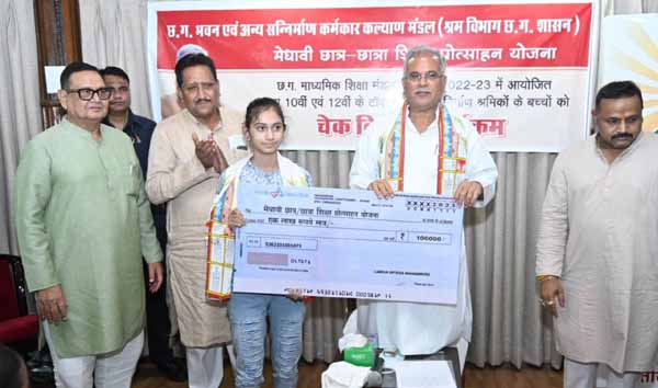 छत्तीसगढ़ भवन एवं सन्निर्माण कर्मकार कल्याण मंडल की सचिव श्रीमती सविता मिश्रा ने बताया कि छत्तीसगढ़ भवन एवं अन्य सन्निर्माण कर्मकार कल्याण मंडल के पंजीकृत निर्माण श्रमिक हेतु संचालित 'मेधावी छात्र-छात्रा शिक्षा प्रोत्साहन योजनाझ् के तहत छत्तीसगढ़ माध्यमिक शिक्षा मंडल द्वारा आयोजित 10वीं एवं 12वीं की कक्षा में टॉप-10 में आने पर श्रमिक के बच्चों को प्रोत्साहन राशि के तहत एक लाख रूपए की राशि प्रदान की जाती है। इस योजना के तहत 2021 में टॉप-10 में जगह बनाने वाले 10वीं एवं 12वीं के तीन छात्र-छात्राएं एवं 2022 में भी तीन छात्र-छात्राएं एवं इस वर्ष 2023 में 10 छात्र-छात्राओं को प्रोत्साहन राशि के तौर पर एक लाख रूपए प्रदान किया गया है।