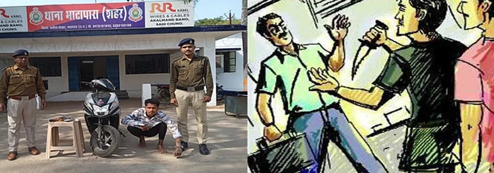 भाटापारा थाना से कुछ ही दूरी में आरोपी ने लूट को अंजाम दिया, प्रार्थी के गले में कैंची नमक नुकीला औजार टिकाकर कीपैड मोबाइल व नगदी रकम की लूट की। पुलिस ने आरोपी को गिरफ्तार कर लिया है। लूट का समान और नकदी रकम को पुलिस ने जब्त कर लिया है। शहर थाना के अनुसार कि प्रार्थी किशन भारती द्वारा रिपोर्ट दर्ज काराया गया कि रात्रि में पैदल खाना खाने होटल ढूंढ रहा था।