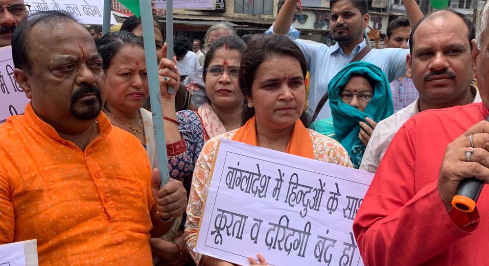 भारत सरकार बांग्ला देश के आंतरिक मामलों में हस्तक्षेप करके बांग्ला देश में रह रहे हिंदुओ की सुरक्षा हर हाल में सुनिश्चित करे. उक्त माँग सकल हिंदू समाज ने उद्धवदास मेहता आयोजन समिति के तत्वावधान में आयोजित विरोध प्रदर्शन में हिंदू जागरण मंच के प्रांत सह संयोजक बालेन्द्र सिंह कुशवाह के कहीं .. विरोध प्रदर्स्गण कर्फ़्यू माता मंदिर पीर गेट पर किया इस दौरान  साध्वी रंजना जी की भी उपस्थिति रही .इस दौरस्न सकल हिंदू समाज के अनेक वक़्ताओ ने सभा को संबोधित किया