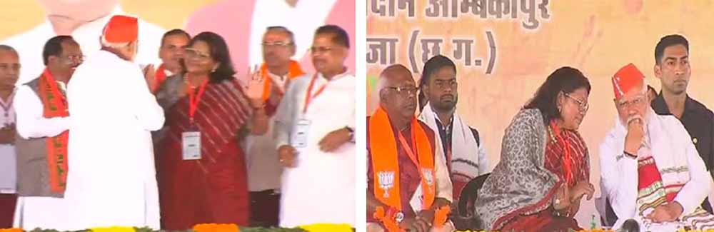 विजय संकल्प शंखनाद रैली को जब प्रदेश के मुख्यमंत्री विष्णुदेव साय संबोधित कर रहे थे तब मंच पर प्रधानमंत्री नरेंद्र मोदी बैठे थे इस दौरान प्रधानमंत्री नरेंद्र मोदी से कुछ दूरी पर बैठी विधायक रेणुका सिंह को नरेंद्र मोदी ने बुलाया और मुख्यमंत्री विष्णुदेव साय जिस कुर्सी पर बैठे थे उसमे बिठाया और लगभग 7 मिनट तक प्रधानमंत्री नरेंद्र मोदी ने विधायक व पूर्व केंद्रीय राज्यमंत्री रेणुका सिंह ने प्रदेश के विकास कार्यों और केंद्र व राज्य सरकार की योजनाओं को लेकर चर्चा करने के बाद प्रधानमंत्री नरेंद्र मोदी ने रेणुका सिंह को दिल्ली आने के लिए कहा।