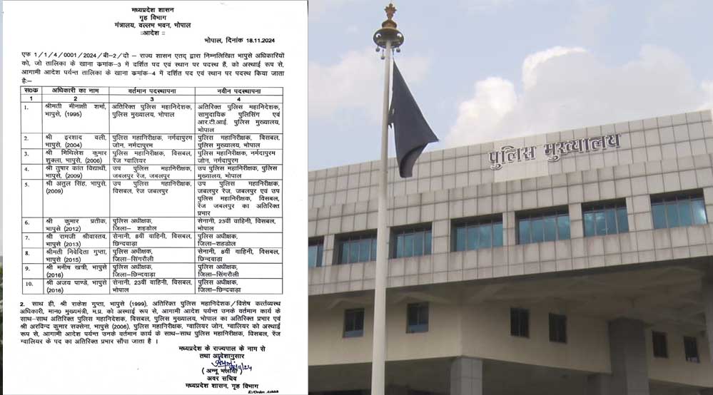 एडीजी, पुलिस मुख्यालय मीनाक्षी शर्मा को सामुदायिक पुलिसिंग एवं आरटीआई पुलिस मुख्यालय एडीजी बनाया गया. आईजी नर्मदापुरम इरशाद वली को आईजी विशेष सशस्त्र पुलिस बल बनाया गया. आईजी विशेष सशस्त्र पुलिस बल ग्वालियर मिथिलेश कुमार शुक्ला को आईजी होशंगाबाद बनाया गया. डीआईजी जबलपुर रेंज तुषार कांत विद्यार्थी को मुख्यालय भेजा गया. जबलपुर डीआईजी अतुल सिंह को डीआईजी जबलपुर रेंज के अलावा विशेष सशस्त्र पुलिस बल जबलपुर का अतिरिक्त प्रभार सौंपा गया.