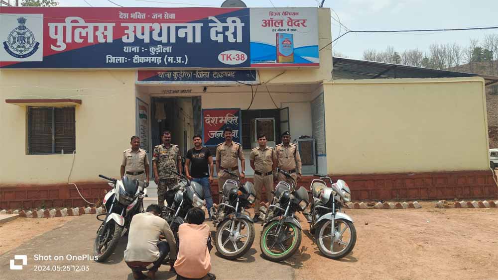 पुलिस अधीक्षक टीकमगढ रोहित काशवानी द्वारा चोरी हुए वाहनों को बरामद कर आरोपियों को गिरफ्तार करने हेतु हेतु निर्देशित किया है। इसी तारतम्य मे अतिरिक्त पुलिस अधीक्षक टीकमगढ सीताराम व एसडीओपी टीकमगढ राहुल कटरे के मार्गदर्शन में थाना प्रभारी निरीक्षक पंकज शर्मा के नेतृत्व में चौकी प्रभारी देरी उप निरीक्षक चंदन शाक्य द्वारा सूरज पिता भोला चढार उम्र 19 साल निवासी अचढट थाना नौगांव, सेवाराम पिता लल्लू चढार उम्र 21 साल निवासी देरी से चौकी देरी थाना खरगापुर अंतर्गत चोरी की गई पांच मोटर साईकिलो को दिनांक 24.05.24 को जप्त किया गया।