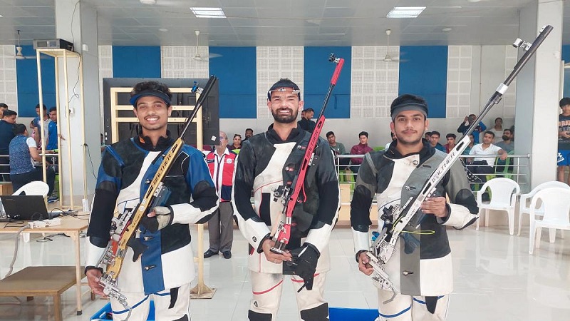 केरल के तिरूवनंतपुरम के वट्टीयूरकाव शूटिंग रेन्ज में चल रही 65वीं राष्ट्रीय रायफल शूटिंग चेम्पियनशिप में मध्यप्रदेश राज्य शूटिंग अकादमी के शूटर्स ने मेन्स टीम इवेंट में सोने पर निशाना साधा है। अकादमी के ऐश्वर्य प्रताप सिंह तोमर, हर्षित बिंजवा और गोल्डी गुर्जर की तिकड़ी ने 50 मीटर रायफल सीनियर मेन्स टीम इवेंट में स्वर्ण पदक हासिल किया। इसके अलावा 50 मीटर रायफल थ्री-पोजिशन सीनियर मेन्स सिविलियन टीम इवेंट में अकादमी के अमित कुमार, हर्षित बिंजवा और याकूब सिद्धीकी ने भी स्वर्ण पदक हासिल किया। टीम इवेंट का तीसरा स्वर्ण 50 मीटर थ्री-पोजिशन जूनियर मेन्स में अकादमी के शूटर्स अविनाश यादव, अमित सिंगरोले और आदर्श ने जीता। इसी कड़ी में 50 मीटर थ्री-पोजिशन जूनियर मेन्स सिविलियन टीम इवेंट में अकादमी के समीर उल्ला खान, अमित सिंगरोले और आदर्श तिवारी ने स्वर्ण पदक हासिल किया।