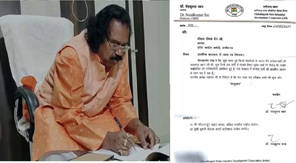 साय ने अपने इस्तीफा में लिखा है कि कुछ समय पहले किन्हीं स्थितियों के कारण मैंने कांग्रेस पार्टी की सदस्यता ग्रहण की थी, कुछ दिनों तक पार्टी में रहकर निष्ठापूर्वक कार्य भी किया। मेरे सामने जो परिस्थितियां उपस्थित हुई है, उसे देखकर मैं कांग्रेस पार्टी की प्राथमिक सदस्य से त्याग पत्र दे रहा हूं। साय ने कांग्रेस में रहते हुए सीएम विष्णुदेव साय को बधाई देने गए थे। माना जा रहा है कि बीजेपी हाईकमान से अनुमति मिलने के बाद साय बीजेपी का दामन थाम सकते हैं।