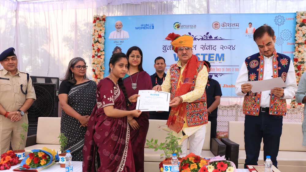 कार्यक्रम में संयुक्त राष्ट्र महिला की स्टेट हेड ज्योति रे द्वारा बताया गया कि वी इन स्टेम प्रोग्राम यूएन वीमेन (UN-Women) और मध्यप्रदेश राज्य कौशल विकास एवं रोजगार निर्माण बोर्ड भोपाल के संयुक्त तत्वाधान में प्रशिक्षण कार्यक्रम चल रहा है। अभी तक प्रदेश के 12 आदिवासी बाहुल्य जिलों में प्रशिक्षण कार्यक्रम संचालित किये जा रहे हैं। झाबुआ जिले में स्टेम (विज्ञान, टेक्नोलॉजी, इंजीनियरिंग, गणित) ट्रेड में प्रशिक्षित 11 बालिकाओं का टाटा मोटर्स में प्लेसमेंट हुआ है।