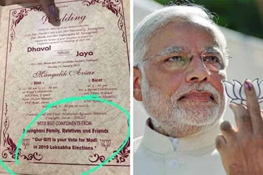 आगामी लोकसभा चुनाव को लेकर राजनीतिक दल प्रचार-प्रसार में लगे हुए हैं। अलग-अलग पार्टियों और नेताओं के समर्थक भी इसमें अपना योगदान दे रहे हैं। मगर, प्रधानमंत्री नरेंद्र मोदी का एक जबरा फैन हैदराबाद से सामने आया है। संगारेड्डी जिले में रहने वाले इस व्यक्ति के बेटे की शादी है। इसने मेहमानों से इसे लेकर एक अनोखी अपील की है। उसने कहा कि आप लोग मेरे बेटे की शादी में गिफ्ट लेकर मत आना। मगर, उसकी डिमांड कुछ और ही है। इस शख्स ने शादी को लेकर जो इनविटेशन कार्ड छपवाया है उस पर पीएम मोदी की तस्वीर लगी हुई है। साथ ही यह भी लिखा है कि 'नरेंद्र मोदी को आपका एक वोट हमारे लिए बेस्ट गिफ्ट होगा।'