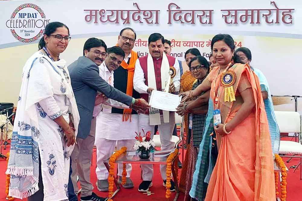 राष्ट्रीय राजधानी नई दिल्ली के भारत मंडपम में 43वें भारतीय अंतर्राष्ट्रीय व्यापार मेले में मंगलवार को "मध्यप्रदेश दिवस" का आयोजन किया गया। मुख्यमंत्री डॉ. मोहन यादव ने मेले में विभिन्न विभागों से शामिल स्व-सहायता समूह, उद्यमियों व कलाकारों को पुरस्कृत किया। मध्यप्रदेश के नगरीय प्रशासन एवं विकास विभाग अंतर्गत संचालित राष्ट्रीय शहरी आजीविका मिशन के तहत 2 स्व-सहायता समूहों को प्रथम व द्वितीय पुरस्कार मिले। प्रथम स्थान पर धार के मांडव का रेवा स्व-सहायता समूह रहा, जिन्हें बाग प्रिंट के लिए पुरस्कार मिला। वहीं संत रविदास स्व-सहायता समूह उज्जैन को बांस से बनी हुई सामग्री एवं कलात्मक खिलौने गुड़िया के लिए द्वितीय पुरस्कार दिया गया।