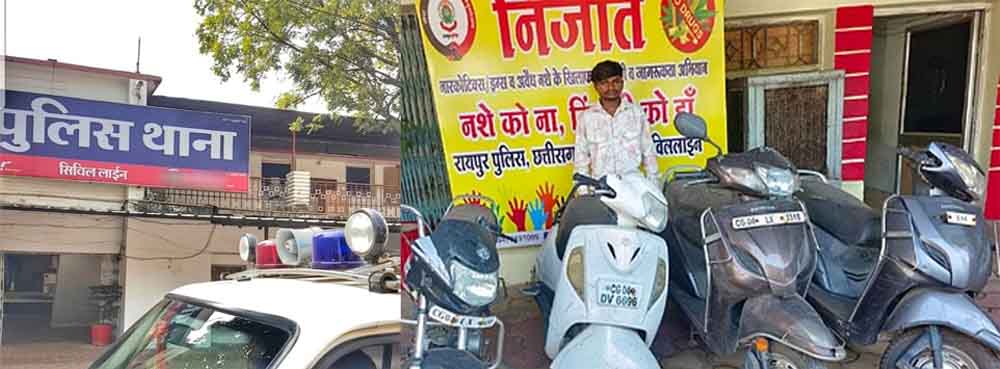 राजधानी रायपुर में बाइक चोरी का मामला थमने का नाम नहीं ले रहा है। शहर में आये दिन बाइक चोरी का मामला सामने आ रहा है। आरोपी रायपुर शहर में घूम-घूमकर चोरी की घटना को अंजाम देता था। पुलिस ने आरोपी को चार मोटर सायकल के साथ गिरफ्तार किया है। प्रार्थी झग्गर महिलांग ने सिविल लाइन थाना में रिपोर्ट दर्ज कराया था।