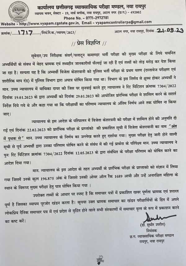छत्तीसगढ़ व्यावसायिक परीक्षा मण्डल ने सूबेदार/उप निरीक्षक संवर्ग/पलाटून कमाण्डर भर्ती परीक्षा की मुख्य परीक्षा में चयन के संबंध में प्रसारित भ्रामक एवं तथ्यहीन जानकारियों का खण्डन करते हुए स्पष्ट किया है कि अभ्यर्थी विजेता केशरवानी को पुलिस भर्ती परीक्षा के प्रथम चरण (दस्तावेज परीक्षण एवं शारीरिक माप दंड) में पुलिस विभाग द्वारा अपात्र घोषित किया गया था।