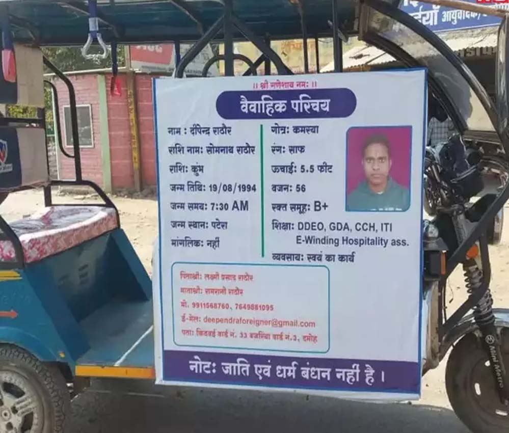 शादी के लिए परेशान एक शख्स ने अनूठा तरीका खोज लिया। एमपी के दमोह में एक युवक अपनी शादी करने के लिए अनोखे अंदाज में लड़की तलाश कर रहा है। उसने ई-रिक्शा में एक बड़ा होर्डिग लगाया है, जिसमें उसने अपना वैवाहिक परिचय दिया है। इसके साथ ही उसने ई रिक्शा में अपनी फोटो भी लगा रखी है।