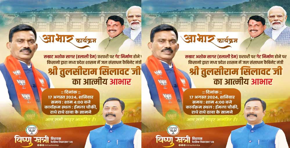 जल संसाधन मंत्री तुलसीराम सिलावट बैरसिया वासियों को सम्राट अशोक सागर (हलाली डेम) का छरछरी पर गेट निर्माण होने पर क्षेत्र के किसान एवं रहवासी आत्मीय स्वागत करेंगे।उल्लेखनीय है कि बैरसिया विधायक विष्णु खत्री के अथक प्रयासों से हलाली डेम का नाम सम्राट अशोक सागर किया गया है। इससे पूर्व हलाली नदी का नाम भी बाणगंगा नदी किया गया है।साथ ही ईंटखेड़ी स्थित नदी घाट पर शौर्य स्मारक का निर्माण कर क्षेत्र वासियों को विधायक विष्णु खत्री ने सौगात दी थी।