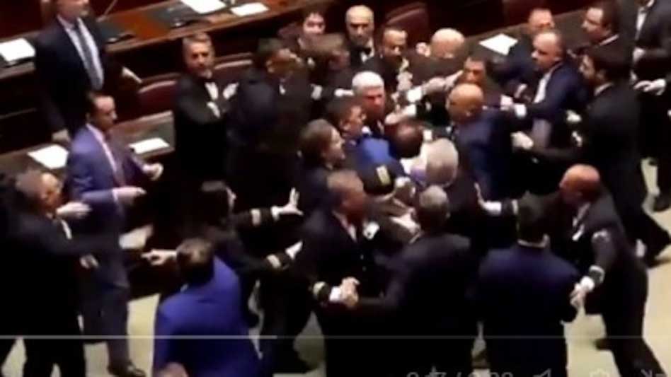 वीडियो में देखा जा सकता है कि विपक्षी पार्टी के सांसद लियोनार्डो डोनो सरकार में मंत्री रॉबर्टो कैलडेरोली को इटली का झंडा देने की कोशिश कर रहे हैं. लेकिन डोनो ने झंडा लेने से इनकार कर दिया और पीछे हट गए. इस बीच अन्य सासंदों की भीड़ उमड़ पड़ी और देखते ही देखते दोनों पक्षों में लात और घूसे चलने लगे.