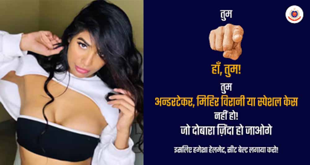 सोशल मीडिया पर ट्रेंडिंग कंटेंट के जरिए दिल्ली पुलिस आए दिन अपील करती रहती है। अभिनेत्री और मॉडल पूनम पांडे की मौत के अफवाह पर दिल्ली पुलिस ने अनोखे अंदाज में लोगों से अपील की है। सोशल मीडिया पर शेयर किये एक पोस्ट में बिना पूनम पांडेय का नाम लेते हुए लोगों को संदेश दिया गया है। सेफ ड्राइविंग के लिए सीट बेल्ट और हेलमेट जरूर पहनने को लेकर पोस्ट किया गया है,''आप स्पेशल केस नहीं हैं, जो मरकर फिर से जिन्दा हो जाएंगे।"