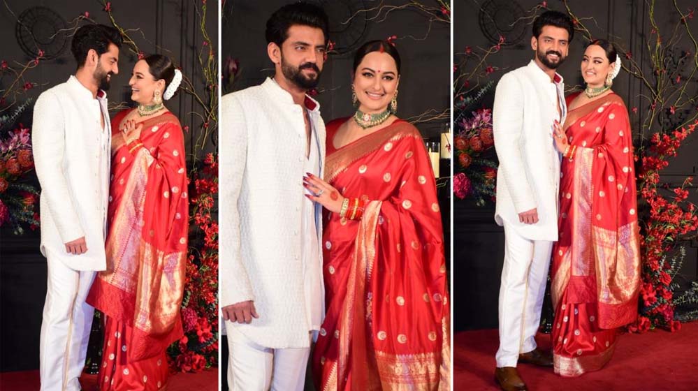 सोनाक्षी ने अपने रिसेप्शन में लाल रंग की बनारसी सिल्क साड़ी पहनी। जिसमें उनकी खूबसूरती निखर कर सामने आ रही थी। हसीना ने Raw Mango लेबल की कस्टम रेड 'चांद बूटा' ब्रोकेड साड़ी चुनी थी। जिस पर गोल्डन रंग से प्रिंट करके डिजाइन बनाया गया था। वहीं, जहीर वाइट शर्ट के ऊपर कढ़ाई वाली वाइट बंद गला जैकेट और मैचिंग पैंट्स पहने नजर आए। दूल्हे राजा ने ब्राउन शूज के साथ अपने लुक को कंप्लीट किया। जिसमें वह काफी स्टाइलिश लगे।